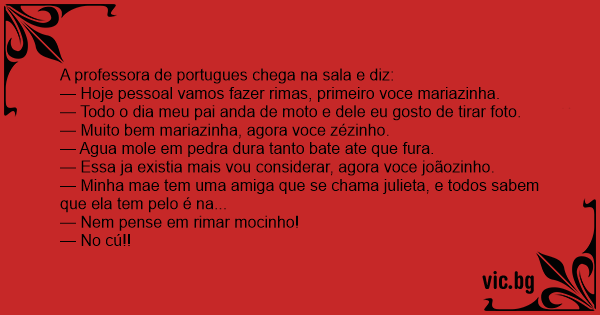 — Hoje pessoal vamos fazer rimas, primeiro voce mariazinha.