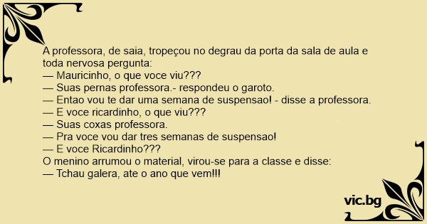 A professora, de saia, tropeçou no degrau da porta da sala de aula e toda nervosa pergunta: