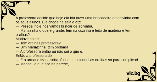 A professora decide que hoje ela iria fazer uma brincadeira de adivinha com os seus alunos. Ela chega na sala e diz: