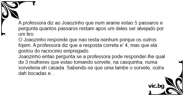 Joaozinho entao pergunta se a professora pode responder-lhe qual de 3 mulheres que estao tomando sorvete, na casquinha, numa sorveteria eh casada. Sabendo-se que uma lambe o sorvete, outra dah bocadas e a terceira chupa o sorvete. Apos o embaraco inicial a professora responde que aquela que chupa o sorvete eh a casada.