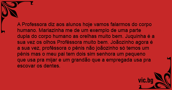 A Professora diz aos alunos hoje vamos falarmos do corpo humano. Mariazinha me de um exemplo de uma parte dupla do corpo humano as orelhas muito bem. Juquinha é a sua vez os olhos Profêssora muito bem. Joãozinho agora é a sua vez, profêssora o pênis não joãozinho só temos um pênis mas o meu pai tem dois sim senhora um pequeno que usa pra mijar e um grandão que a empregada usa pra escovar os dentes.