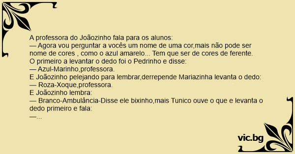 — Agora vou perguntar a vocês um nome de uma cor,mais não pode ser nome de cores , como o azul amarelo... Tem que ser de cores de ferente.