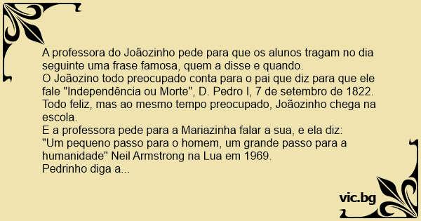 A professora do Joãozinho pede para que os alunos tragam no dia seguinte uma frase famosa, quem a disse e quando.