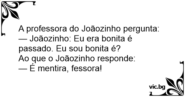 — Joãozinho: Eu era bonita é passado. Eu sou bonita é?