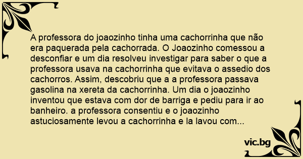 A professora do joaozinho tinha uma cachorrinha que não era paquerada pela cachorrada. O Joaozinho comessou a desconfiar e um dia resolveu investigar para saber o que a professora usava na cachorrinha que evitava o assedio dos cachorros. Assim, descobriu que a a professora passava gasolina na xereta da cachorrinha. Um dia o joaozinho inventou que estava com dor de barriga e pediu para ir ao banheiro. a professora consentiu e o joaozinho astuciosamente levou a cachorrinha e la lavou com bastante sabao e em seguida retornou para a sala de aula. Ноrа depois a professora estranhou a ausencia da сасhоrrа e ficou preocupa. Passou mais um tempo e ela preocupada pergunta para o joaozinho.