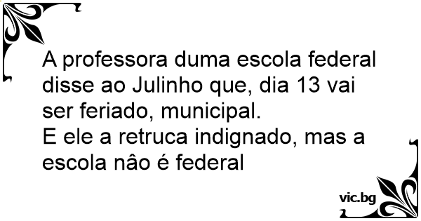 A professora duma escola federal disse ao Julinho que, dia 13 vai ser feriado, municipal.
