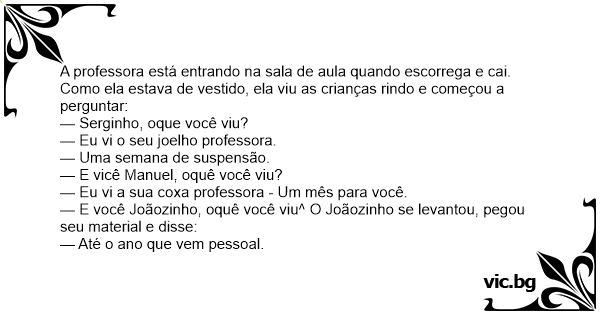 A professora está entrando na sala de aula quando escorrega e cai. Como ela estava de vestido, ela viu as crianças rindo e começou a perguntar: