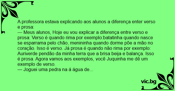 — Meus alunos, Hoje eu vou explicar a diferença entre verso e prosa: Verso é quando rima por exemplo:batatinha quando nasce se esparrama pelo chão, menininha quando dorme põe a mão no coração. Isso é verso. Já prosa é quando não rima por exemplo: Auriverde pendão da minha terra que a brisa beija e balança. Isso é prosa. Agora vamos aos exemplos, você Juquinha me dê um exemplo de verso.