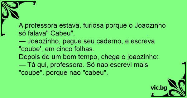 — Joaozinho, pegue seu caderno, e escreva "coube', em cinco folhas.