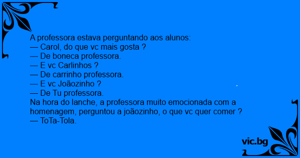 Na hоrа do lanche, a professora muito emocionada com a homenagem, perguntou a joãozinho, o que vc quer comer ?