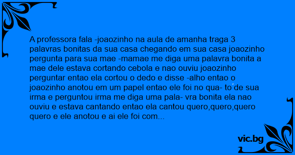 A professora fala -joaozinho na aula de amanha traga 3 palavras bonitas da sua casa chegando em sua casa joaozinho pergunta para sua mae -mamae me diga uma palavra bonita a mae dele estava cortando cebola e nao ouviu joaozinho perguntar entao ela cortou o dedo e disse -alho entao o joaozinho anotou em um papel entao ele foi no qua- to de sua irma e perguntou irma me diga uma pala- vra bonita ela nao ouviu e estava cantando entao ela cantou quero,quero,quero quero e ele anotou e ai ele foi com o irmao e perguntou-irmao me di- ga uma palavra bonita? o irmao nao ouviu e estava cantando a musica do batmam e ai ele cantou batmam entao a professorafalou joaozinho diga sua prime- ira palavra bonita alho voce quer ir para a dire- toria quero,quero,quero,quero quem voce pensa que e batmaaaaaaaaam