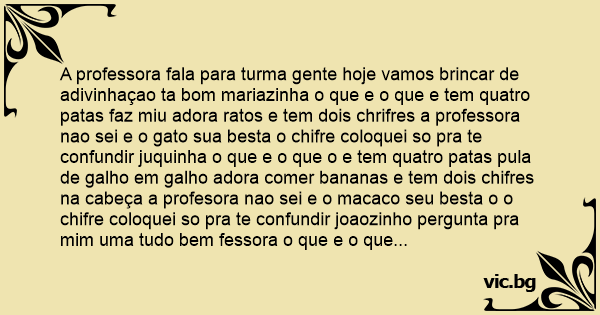 A professora fala para turma gente hoje vamos brincar de adivinhaçao ta bom mariazinha o que e o que e tem quatro patas faz miu adora ratos e tem dois chrifres a professora nao sei e o gato sua besta o chifre coloquei so pra te confundir juquinha o que e o que o e tem quatro patas pula de galho em galho adora comer bananas e tem dois chifres na cabeça a profesora nao sei e o macaco seu besta o o chifre coloquei so pra te confundir joaozinho pergunta pra mim uma tudo bem fessora o que e o que e e durо rolisso da cabeça vermelha com duas bolas embaixo e as mulheres adora colocar na boca joaozinho esta espulso da clase calma fessora e um batom as bolas eu coloquei so pra te confundi