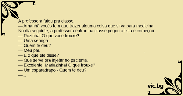 — Amanhã vocês tem que trazer alguma coisa que sirva para medicina.