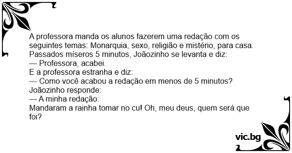 A professora manda os alunos fazerem uma redação com os seguintes temas: Monarquia, sеxо, religião e mistério, para casa.