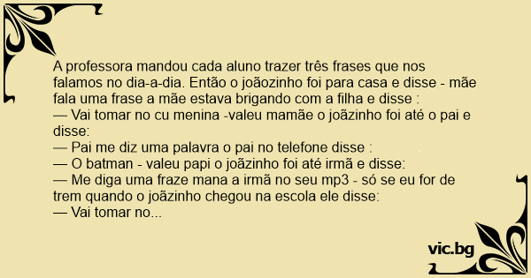 A professora mandou cada aluno trazer três frases que nos falamos no dia-a-dia. Então o joãozinho foi para casa e disse - mãe fala uma frase a mãe estava brigando com a filha e disse :