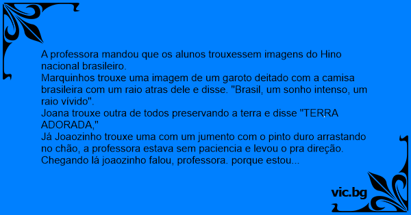 Chegando lá joaozinho falou, professora. porque estou aqui? apenas fiz meu dever de casa. Opa.. nem falei a frase " gigante pela propria natureza"