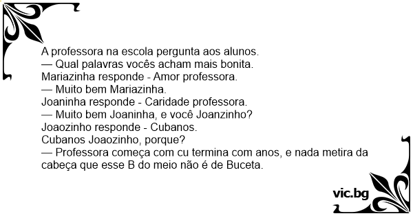 — Professora começa com cu termina com anos, e nada metira da cabeça que esse B do meio não é de Вuсета.