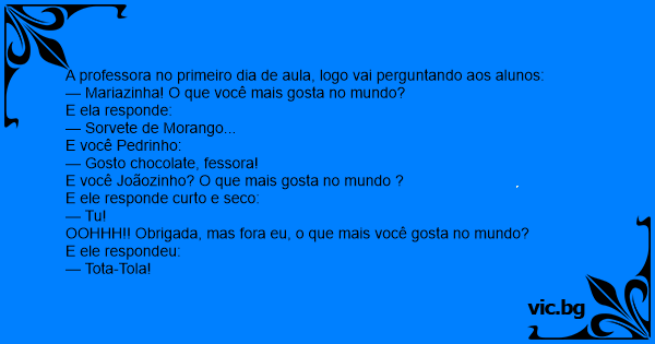 A professora no primeiro dia de aula, logo vai perguntando aos alunos:
