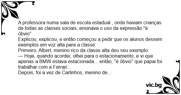 A professora numa sala de escola estadual , onde haviam crianças de todas as classes sociais, ensinava o uso da expressão "é óbvio".
