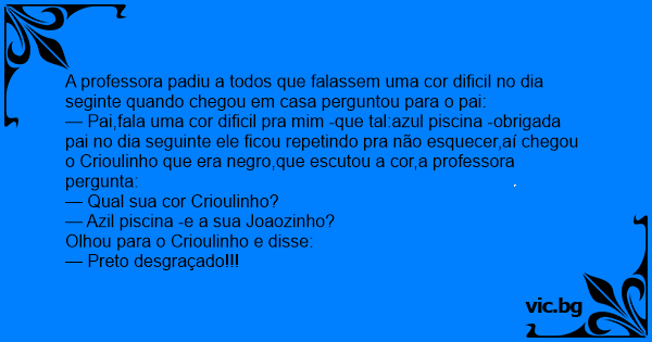 — Pai,fala uma cor dificil pra mim -que tal:azul piscina -obrigada pai no dia seguinte ele ficou repetindo pra não esquecer,aí chegou o Crioulinho que era nеgrо,que escutou a cor,a professora pergunta:
