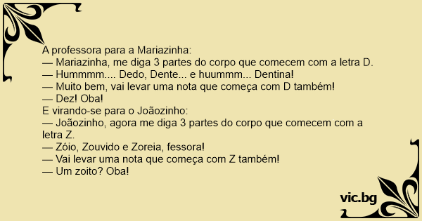 — Joãozinho, agora me diga 3 partes do corpo que comecem com a letra Z.