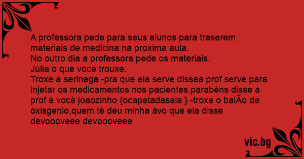 Troxe a serinaga -pra que ela serve dissea prof serve para injetar os medicamentos nos pacientes,parabèns disse a prof è vocè joaozinho {ocapetadasala } -troxe o balÃo de òxisgenio,quem tè deu minha àvo que ela disse devoooveee devoooveee