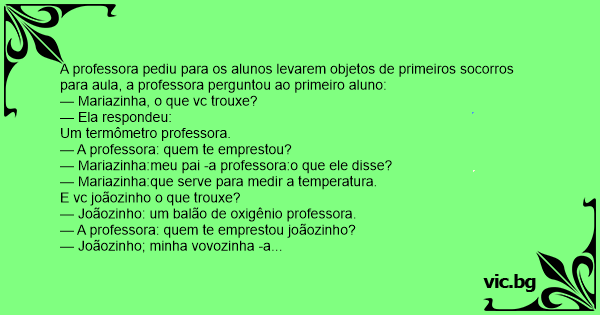 A professora pediu para os alunos levarem objetos de primeiros socorros para aula, a professora perguntou ao primeiro aluno: