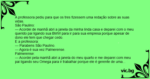 — Acordei de manhã abri a janela da minha linda casa e deparei com o meu querido pai ligando sua BMW para ir para sua empresa porque apesar de dono ele tem que chegar cedo.