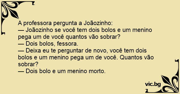 — Joãozinho se você tem dois bolos e um menino pega um de você quantos vão sobrar?