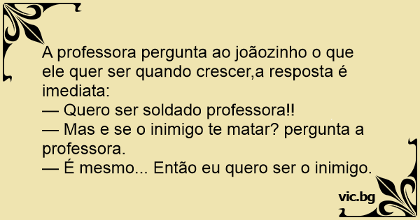 A professora pergunta para joãozinho: — Joãozinho, o que quer ser quando crescer? — Soldado1 - responde ele -mas soldado vai pra guerra e o inimigo mata! diz a professora -Ah! então eu quero ser...