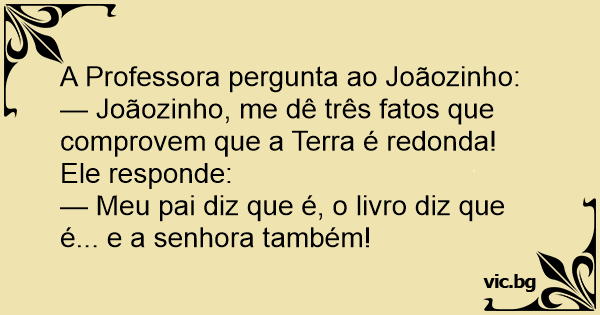 — Joãozinho, me dê três fatos que comprovem que a Terra é redonda!