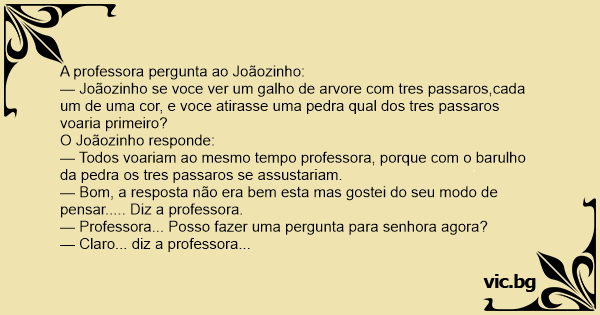 — Joãozinho se voce ver um galho de arvore com tres passaros,cada um de uma cor, e voce atirasse uma pedra qual dos tres passaros voaria primeiro?