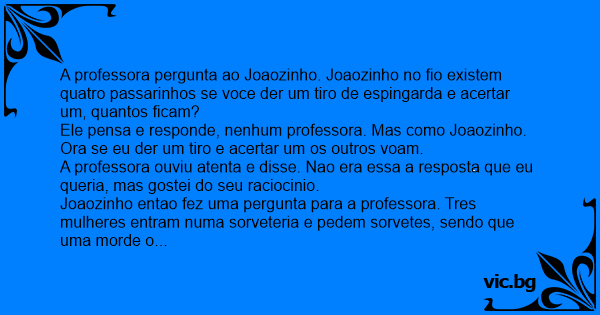 Joaozinho entao fez uma pergunta para a professora. Tres mulheres entram numa sorveteria e pedem sorvetes, sendo que uma morde o sorvete, a outra lambe o sorvete e outra chupa o sorvete, qual delas e casada? A professora pensa e responde. A que chupa. Nao, responde Joaozinho, a casada e aquela que usa alianca no dedo, mas gostei do seu raciocinio.