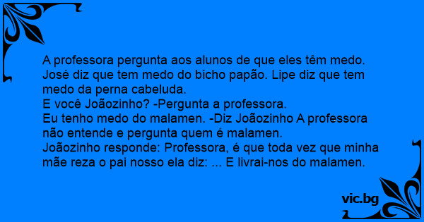 Eu tenho medo do malamen. -Diz Joãozinho A professora não entende e pergunta quem é malamen.
