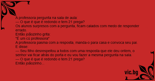 A professora pasma com a resposta, manda-o para casa e convoca seu pai. E disse: