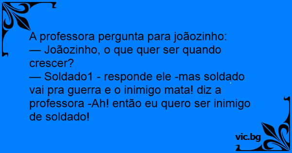 Num certo dia, a professora pergunta pro Joãozinho: — O que você quer ser quando crescer, Joãozinho? — Eu quero ser soldado fesôra. — Mas você corre o risco de ser morto pelo inimigo. — Então agora...