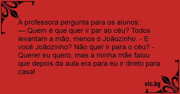 — Quem é que quer ir par ao céu? Todos levantam a mão, menos o Joãozinho. - E você Joãozinho? Não quer ir para o céu? - Querer eu quero, mas a minha mãe falou que depois da aula era para eu ir direto para casa!