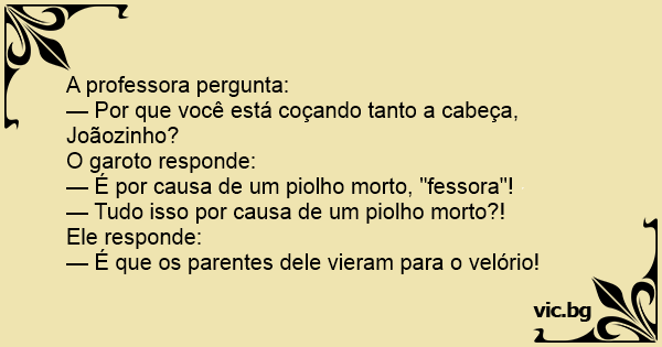 A professora pergunta:<br />— Por que você está coçando tanto a cabeça, Joãozinho?<br />O garoto responde:<br />— É por causa de um piolho morto, "fessora"!<br />— Tudo isso por causa de um piolho morto?!<br />Ele responde:<br />— É que os parentes dele vieram para o velório!