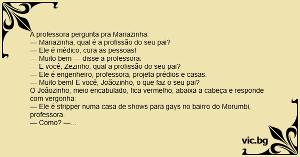 — Ele é stripper numa casa de shows para gаys no bairro do Morumbi, professora.