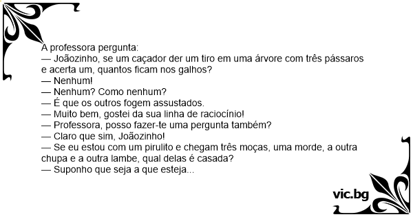 — Joãozinho, se um caçador der um tiro em uma árvore com três pássaros e acerta um, quantos ficam nos galhos?