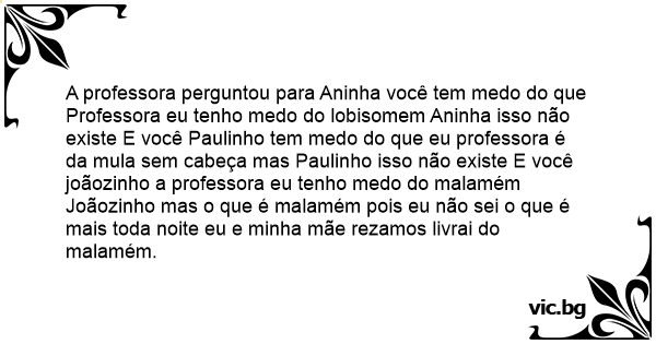 A professora perguntou para Aninha você tem medo do que Professora eu tenho medo do lobisomem Aninha isso não existe E você Paulinho tem medo do que eu professora é da mula sem cabeça mas Paulinho isso não existe E você joãozinho a professora eu tenho medo do malamém Joãozinho mas o que é malamém pois eu não sei o que é mais toda noite eu e minha mãe rezamos livrai do malamém.