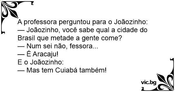 — Joãozinho, você sabe qual a cidade do Brasil que metade a gente come?