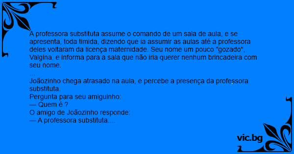 A professora substituta assume o comando de um sala de aula, e se apresenta, toda timida, dizendo que ia assumir as aulas até a professora deles voltaram da licença maternidade. Seu nome um pouco "gozado", Valgina, e informa para a sala que não iria querer nenhum brincadeira com seu nome.