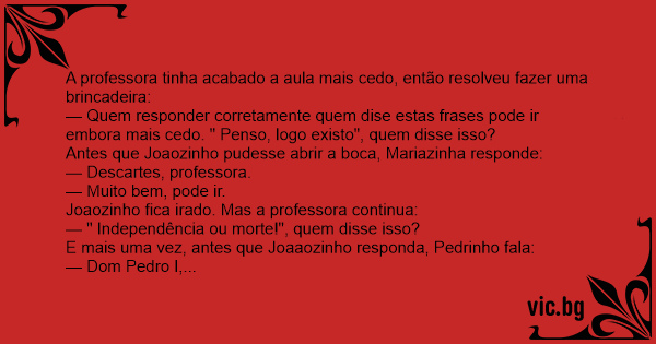— Quem responder corretamente quem dise estas frases pode ir embora mais cedo. " Penso, logo existo", quem disse isso?
