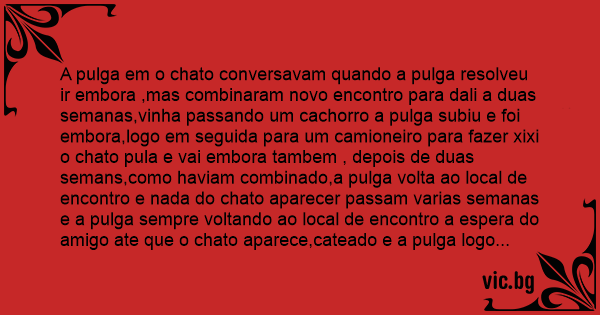 A pulga em o chato conversavam quando a pulga resolveu ir embora ,mas combinaram novo encontro para dali a duas semanas,vinha passando um сасhоrrо a pulga subiu e foi embora,logo em seguida para um camioneiro para fazer xixi o chato pula e vai embora tambem , depois de duas semans,como haviam combinado,a pulga volta ao local de encontro e nada do chato aparecer passam varias semanas e a pulga sempre voltando ao local de encontro a espera do amigo ate que o chato aparece,cateado e a pulga logo pergunta o que houve com o amigo a semanas que espero,eo chato responde,rapaz eu pulei num camioneiro que passou por aqui peguei no sono quando acordei dias depois estava grudado no bigode de um gaucho.
