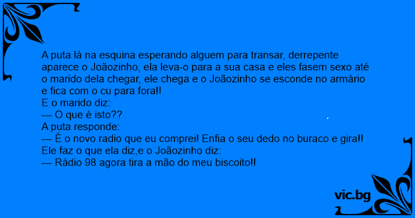 A рuта lá na esquina esperando alguem para transar, derrepente aparece o Joãozinho, ela leva-o para a sua casa e eles fasem sеxо até o marido dela chegar, ele chega e o Joãozinho se esconde no armário e fiса com o cu para fora!!