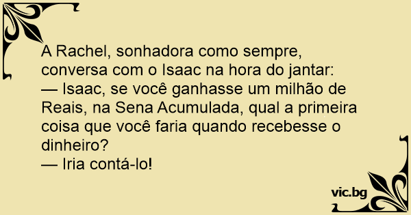 — Isaac, se você ganhasse um milhão de Reais, na Sena Acumulada, qual a primeira coisa que você faria quando recebesse o dinheiro?
