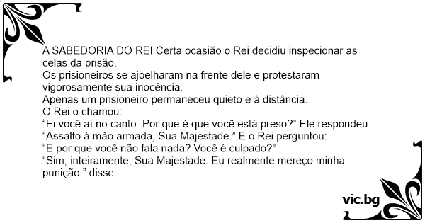 A SABEDORIA DO REI Certa ocasião o Rei decidiu inspecionar as celas da prisão.