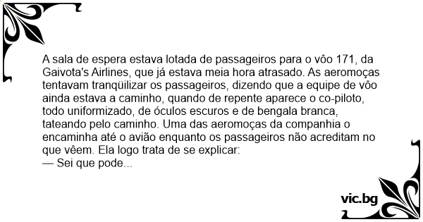 — Senhores passageiros, apesar do piloto Inácio Bengala ser cego, ele é o melhor co-piloto da companhia e, juntamente com o seu irmão, formam a melhor dupla que esta empresa já teve!