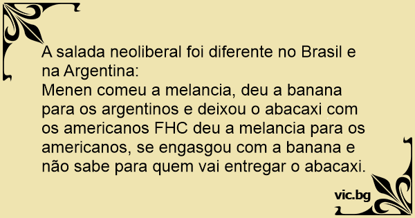 Menen comeu a melancia, deu a banana para os argentinos e deixou o abacaxi com os americanos FHC deu a melancia para os americanos, se engasgou com a banana e não sabe para quem vai entregar o abacaxi.